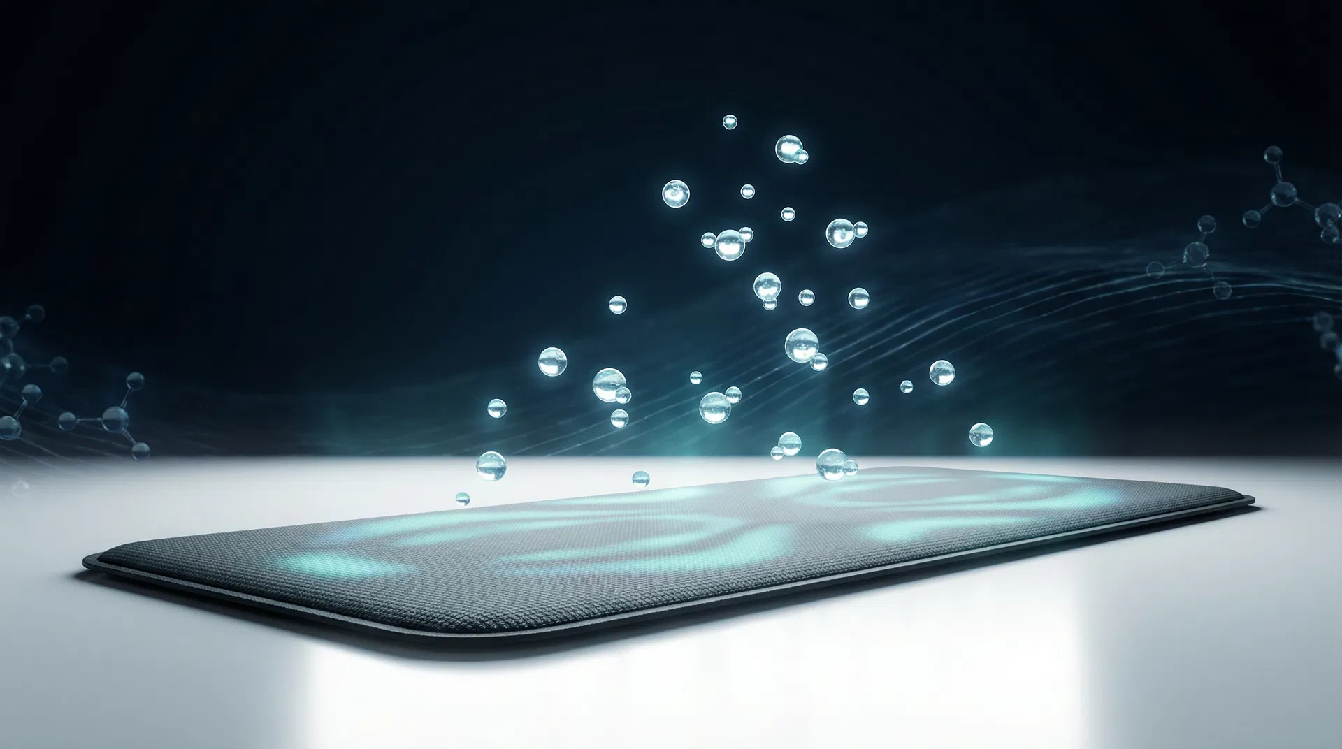 Simply turn on the device and place the mat in contact with your body. Radio waves transmitted through the body vibrate and micronize water molecules.